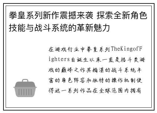 拳皇系列新作震撼来袭 探索全新角色技能与战斗系统的革新魅力
